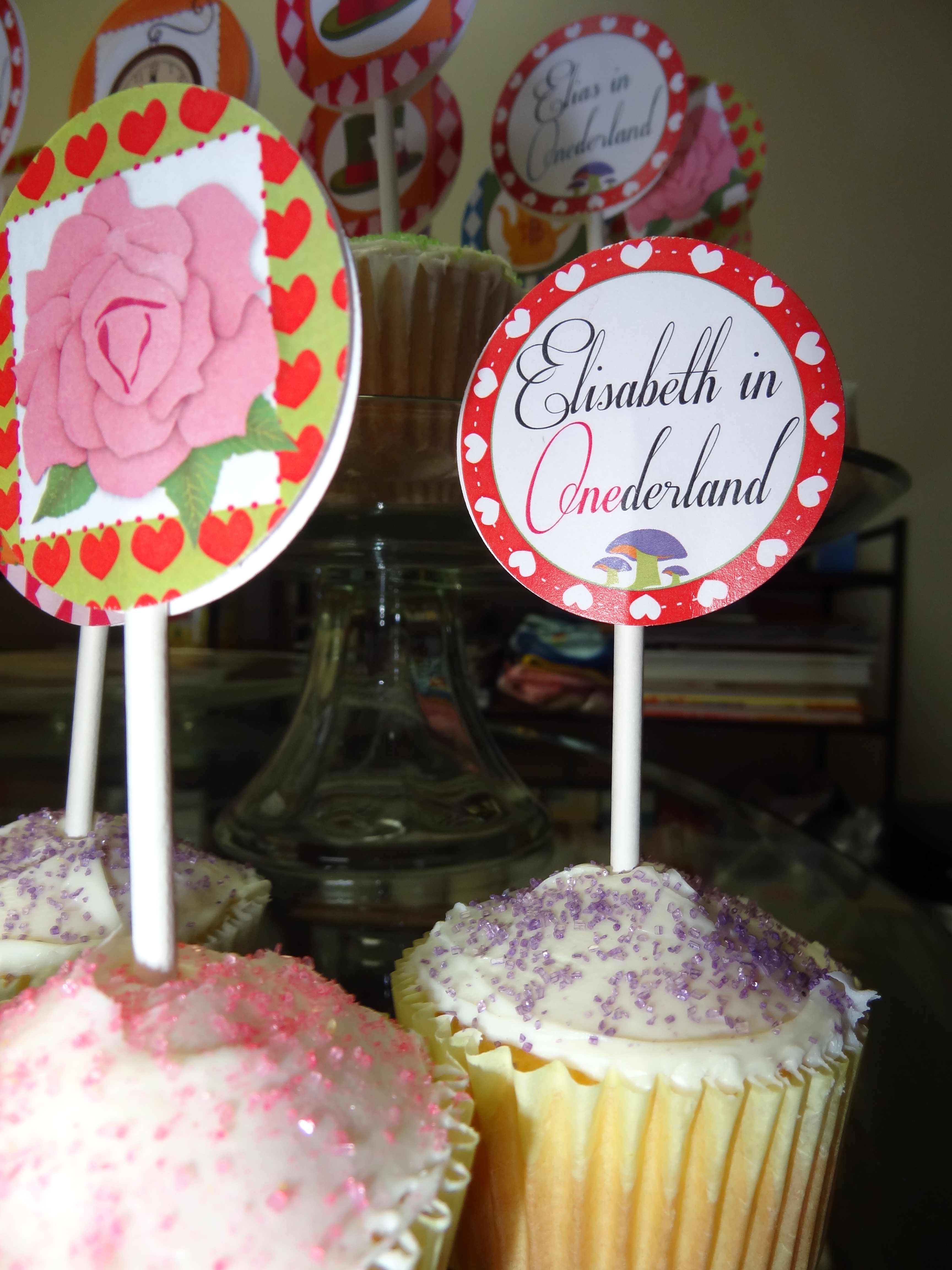 I took to Etsy and ordered a Onederland themed package: invitations, cupcake toppers, birthday banner, cute little cards that said “Eat me” and “Drink me”, the whole shebang. I sure as hell wasn’t going to make any of those things on my own. Please. I also ordered Elisabeth an Alice smock, which might have been a little over the top, but, well, she only turns one once.