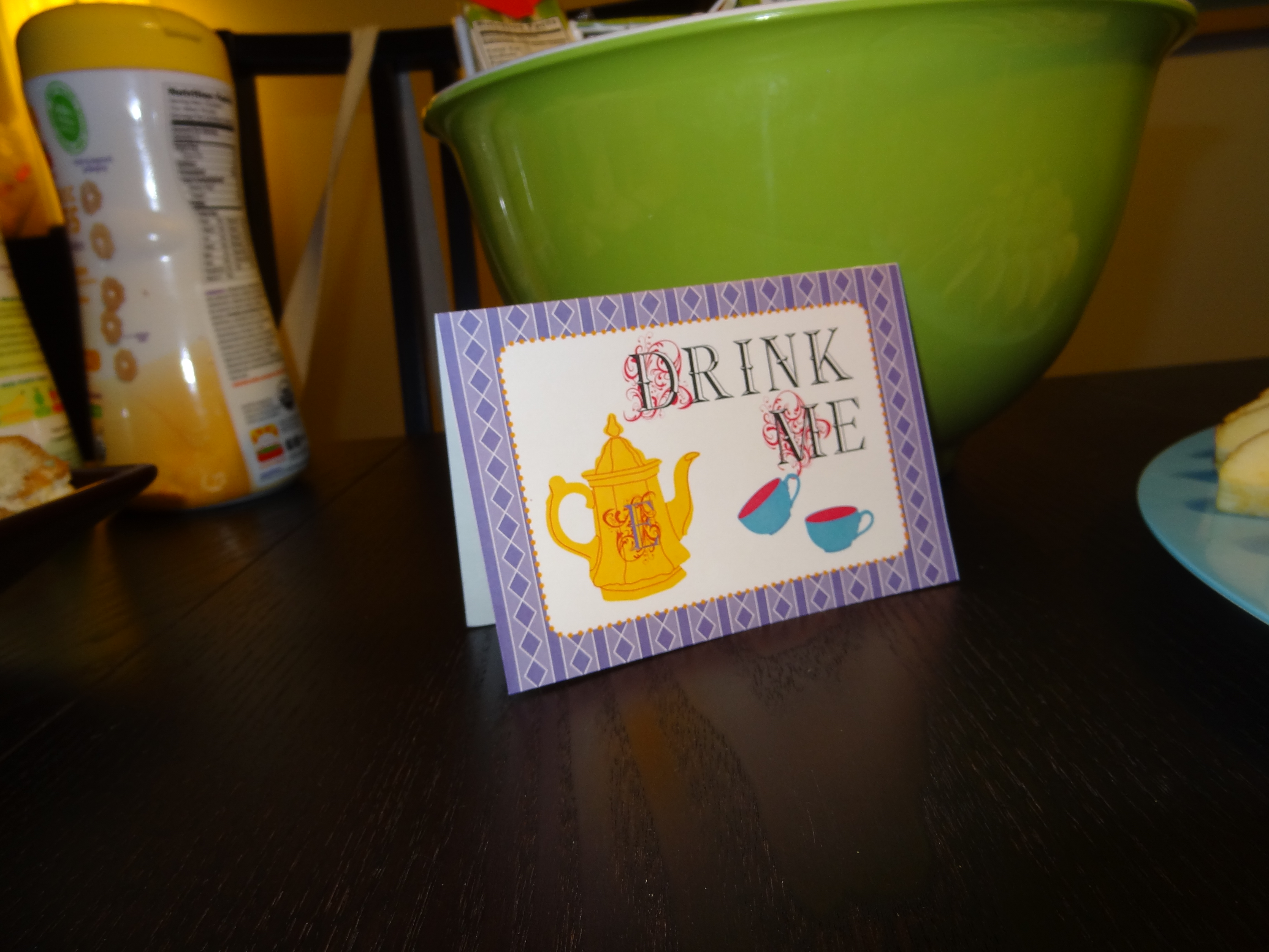 Next we had to plan the menu. Try as I might, I couldn’t figure out a menu to appropriately coordinate with the Alice in Wonderland theme. Mushrooms and hookah just didn’t seem appropriate. So we went with kid-friendly basics: string cheese, peanut butter sandwiches, fruit, and cupcakes. In my Martha madness, I actually searched online for Alice in Wonderland cookie cutters for the sandwiches. In a moment that I like to think bonded us forever, Claudia admitted that she had, too. But apparently there isn’t a huge market for those. To make up for my lack of character-shaped sandwiches, I made frosted sugar cookies with “Eat Me” written on them as party favors* – take that, Martha!