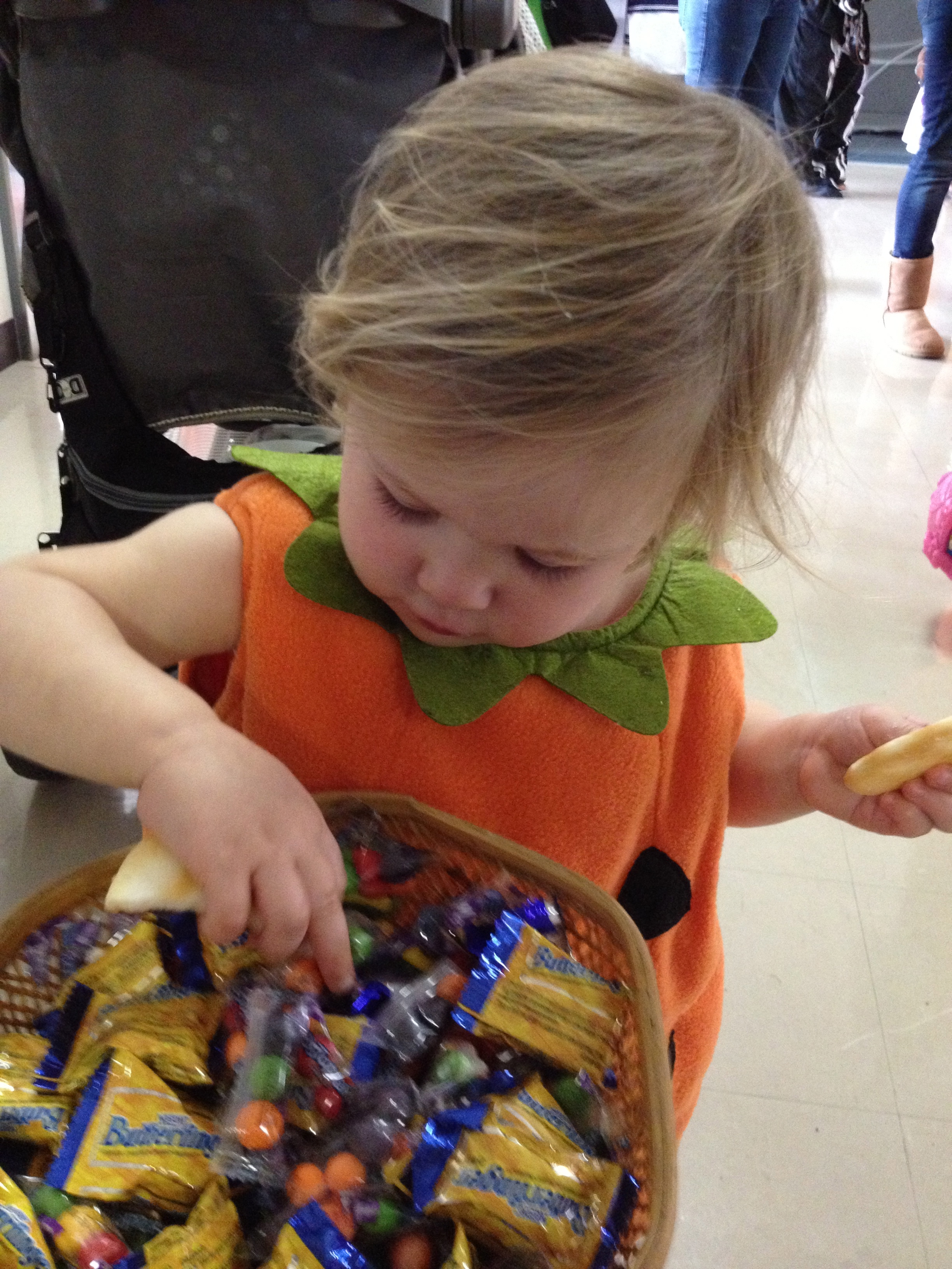 Ah, yes. Turns out almost 2-year-olds (or at least my almost 2-year-old) don’t want to dress up. Even though Elisabeth had expressed a fascination with pumpkins from the day I placed two outside our door in my pathetic attempt to decorate, she wanted absolutely nothing to do with her costume. Maybe she truly was angry I had put so little effort into it and had a meltdown in protest, or maybe she was just being difficult to be difficult. I’ll never know. All I know is when it came time to don her costume, Elisabeth refused. The moment I tried to dress her, she began wailing and ripping the costume off. I tried bribing. “If you put the pumpkin on, you get candy!” This bribe proved ineffective, as Elisabeth had yet to learn what “candy” was.